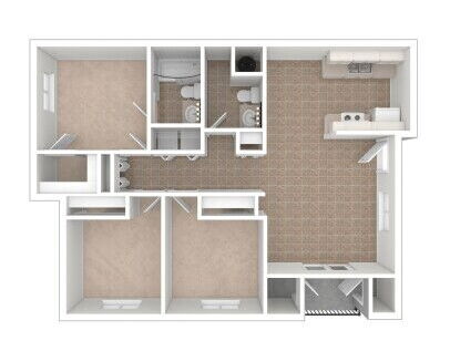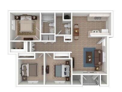 Our three-bedroom Gala floor plan features a spacious master suite with walk-in closet, open living and dining area, and a private patio or balcony.
