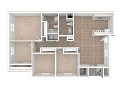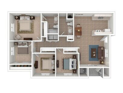 Our four-bedroom Ambrosia floor plan offers a spacious master bedroom with attached bathroom, open living and dining areas, and a private patio or balcony with additional storage.